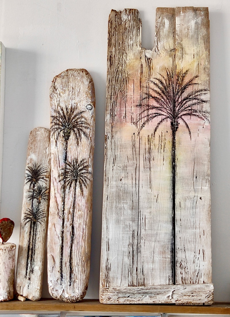 La madera que el mar arrastra hasta la costa lleva consigo historias: el vaivén de las olas, la caricia del viento y el paso del tiempo. En la colección Palmeras, doy nueva vida a estas maderas, convirtiéndolas en piezas que celebran la conexión entre la naturaleza y la creatividad.