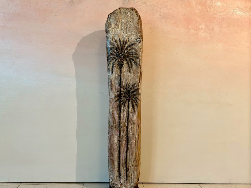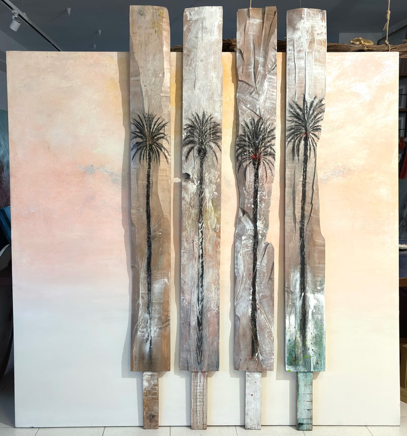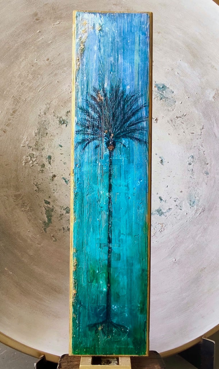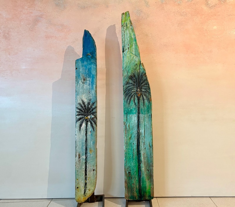Cada tabla se transforma en un soporte único, embellecido con la figura de la palmera, un árbol que simboliza el paraíso y el eje cósmico que une cielo y tierra.